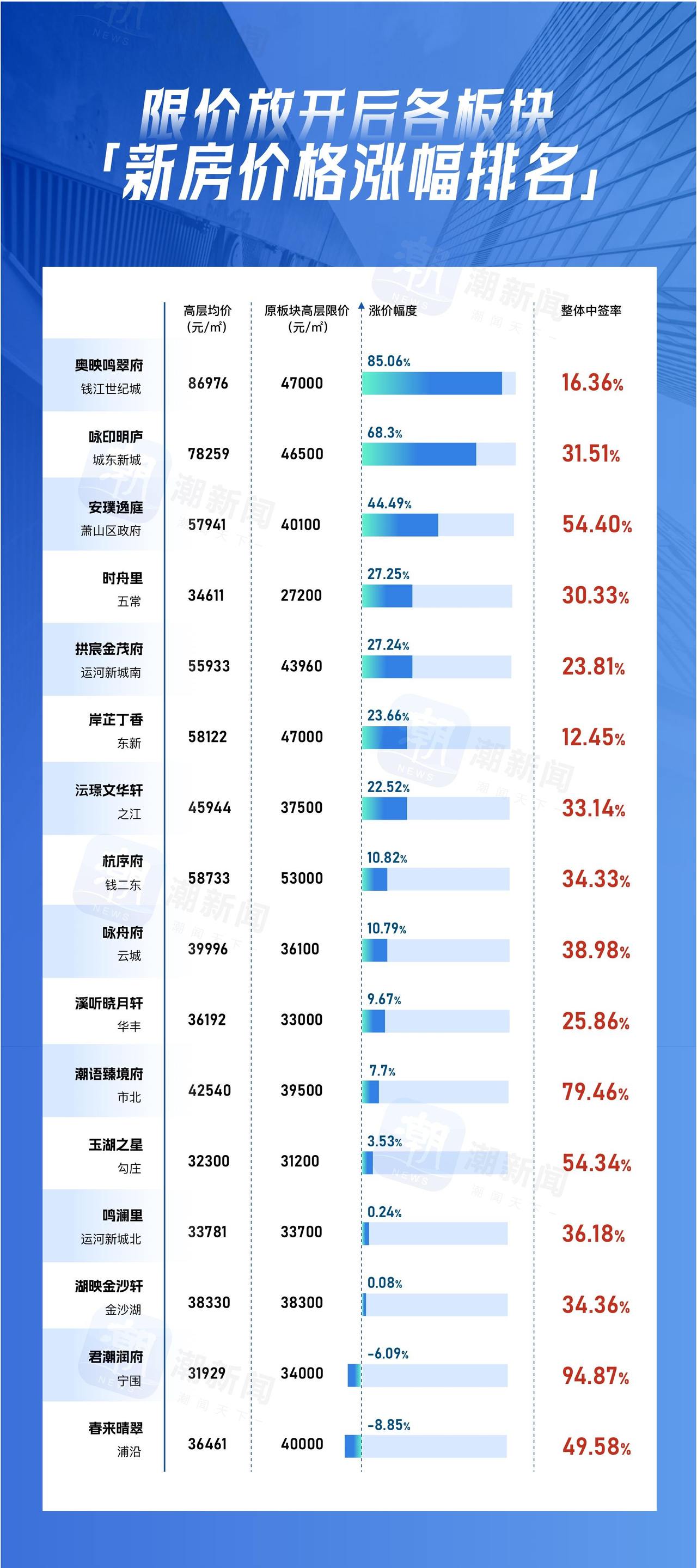 随着不限价楼盘纷纷入市,杭州大多数板块的高层房源都有了新的市场定价。潮新闻美好生活研究院通过已有数据,整理出十余个板块目前最高的新房价格以及对应的楼盘,还有它们较之前限价时的涨幅。从中我们不难看出,不是每个板块涨价后都有人买单,也可从侧面反映哪些板块的认可度较高,即使涨价,只要产品品质跟上,依然能卖得很好。