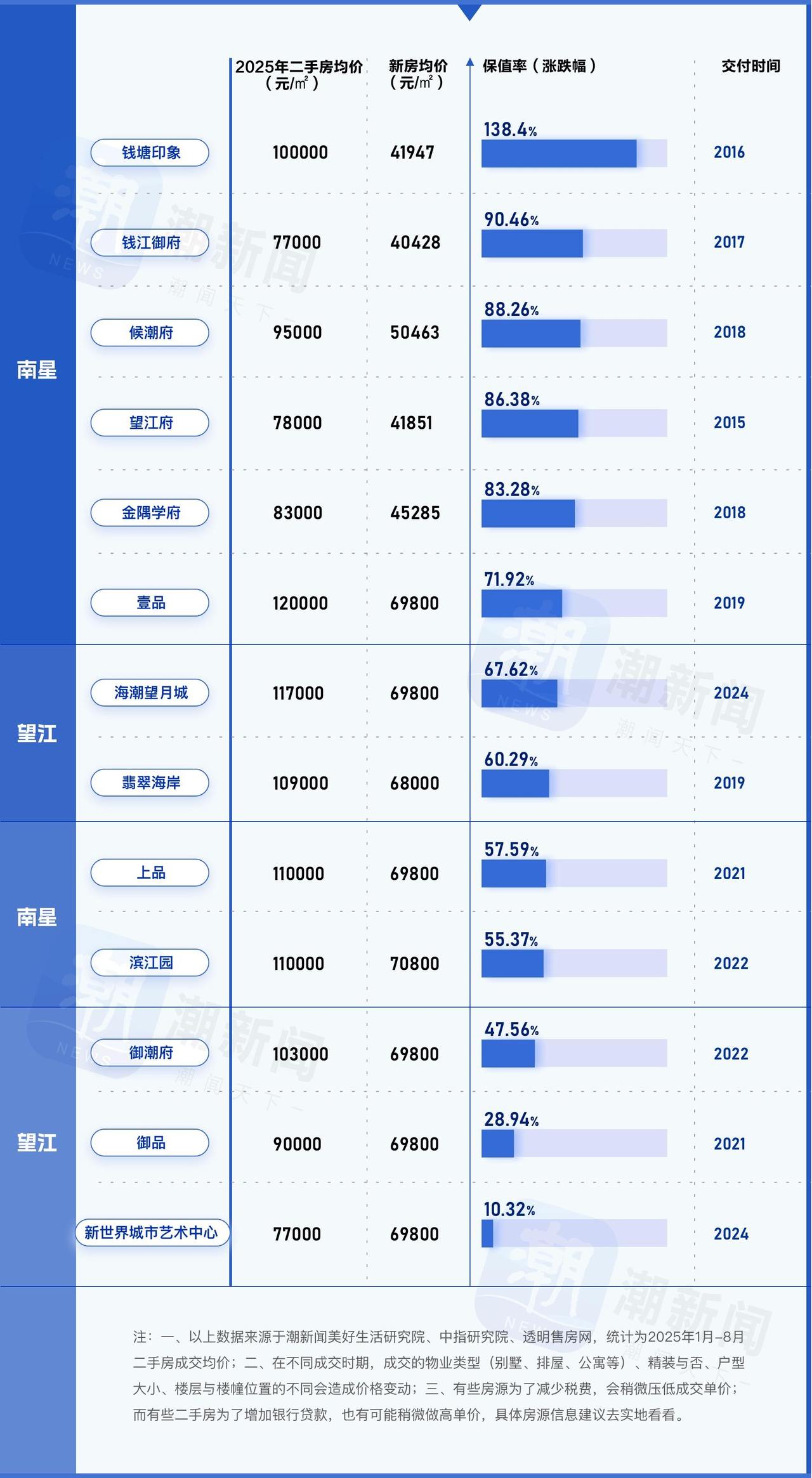 南星桥和望江新城,是杭州传统的豪宅区。在过去十年左右时间里,其交付小区二手房价保值率如何?潮新闻美好生活研究院选取了10余个次新小区房价样本,为大家做参考。