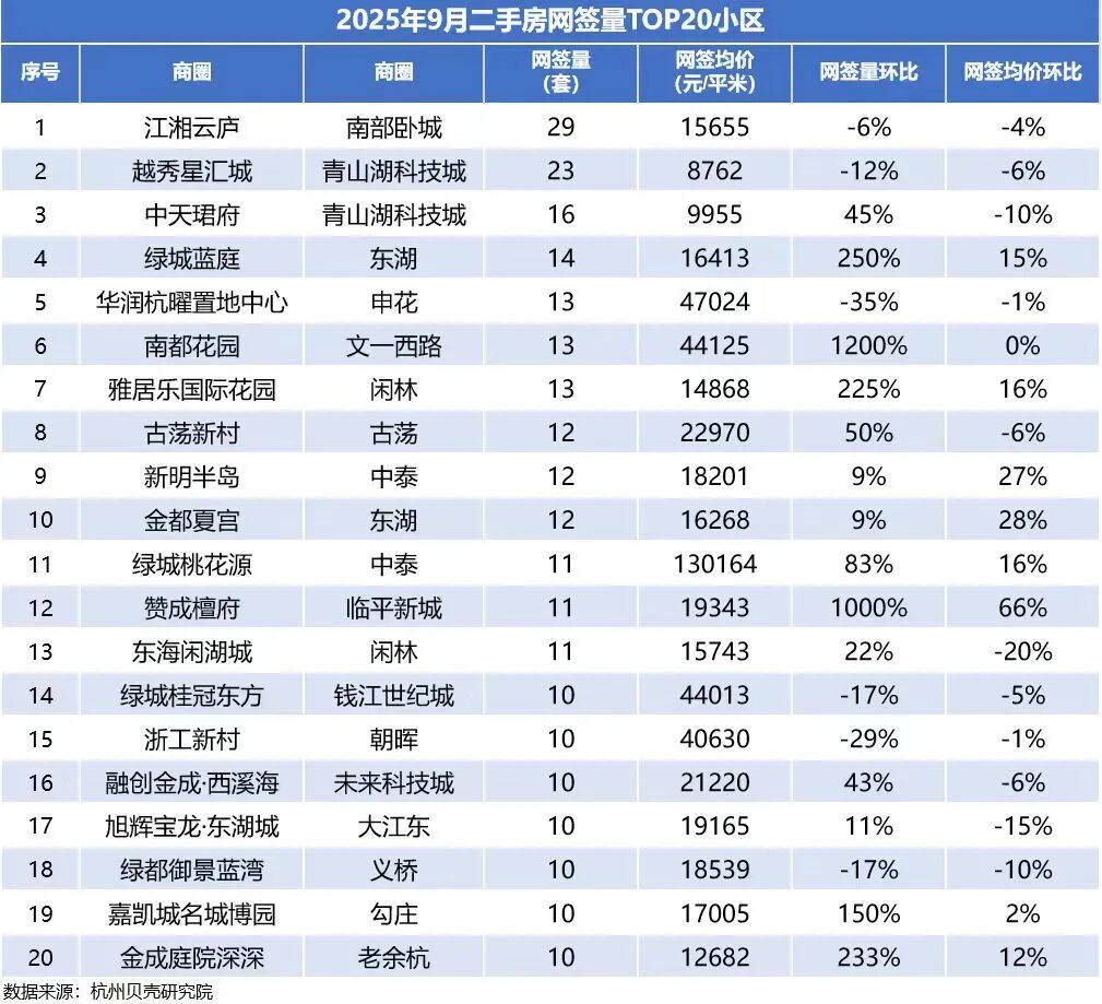 这13个小区,分布在闲林、南部新城、青山湖科技城、大江东等板块,而青山湖科技城的越秀星汇城和中天珺府网签均价更是低至八九千元,9月份成交套数分别为23套、16套。