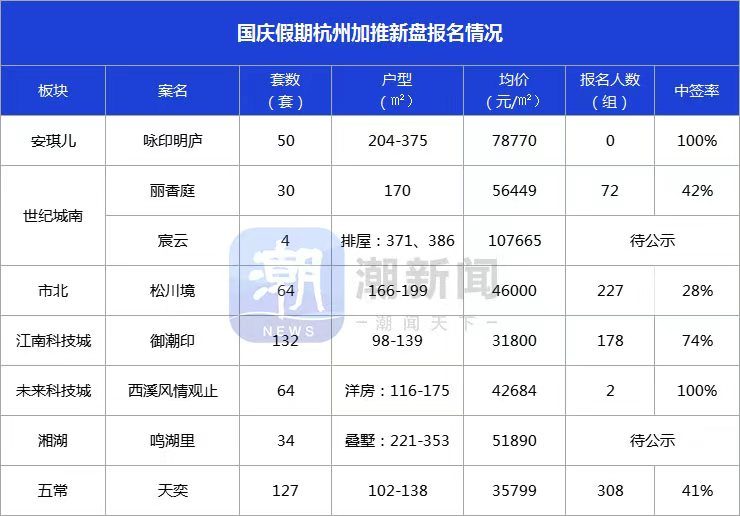 还有多个刚需项目选择假期首开入市,萧山的御潮印和余杭的天奕领出首张预售证,总价都在300万元级。从报名情况看,相较于总价上千万的项目,刚需购房者相对多一些。