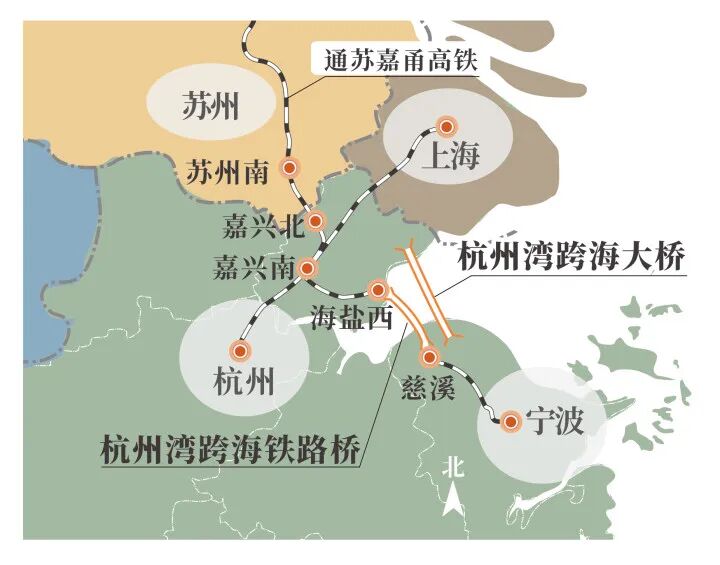 可以预见的是,杭州湾跨海铁路桥建成后,同样将大大利好宁波,作为通苏嘉甬高铁的跨海通道,将来从宁波出发的高铁列车,可以经通苏嘉甬高铁跨越杭州湾,不用再绕道至杭州,直接到达北岸的嘉兴,之后可以转至沪昆高铁往上海方向运行,坐高铁往来上海和宁波之间的耗时和路程也将大幅缩短,预计一小时左右就可以从宁波坐高铁到上海。