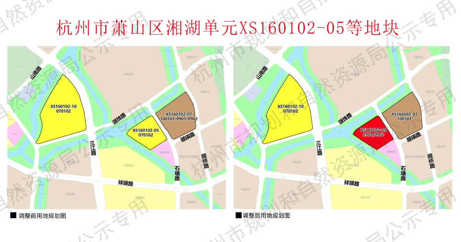 调整范围:规划地块位于杭州市萧山区湘湖单元闻堰街道长安村,涉及三块建设用地,XS160102-05地块,东至规划石塘路,南至规划幼儿园用地,西、北至规划沿河绿地,用地面积1.65公顷;XS160102-07地块,东至规划顺桥路,南至规划顺瑛路,西至规划石塘路,北至规划沿河绿地,用地面积2.55公顷;XS160102-10地块,东至规划三江路,南至规划瑛珠路,西、北至沿河绿地,用地面积4.56公顷。