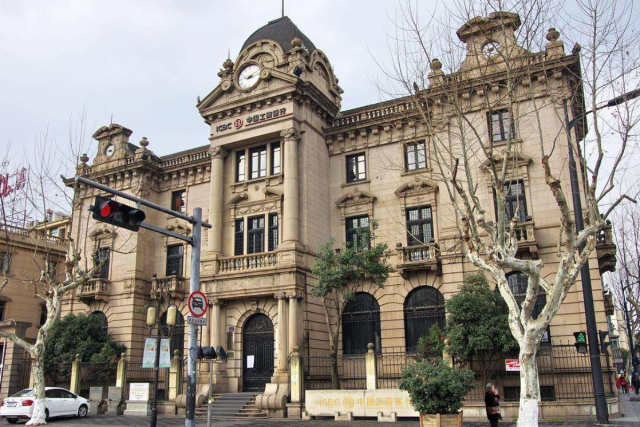 它门口那块灰斑点点的石块上写着它的身世:此楼始建于1918年前后,1923年建成后成为省内标志性金融建筑——浙江兴业银行。该楼现为中国工商银行杭州市羊坝头支行。