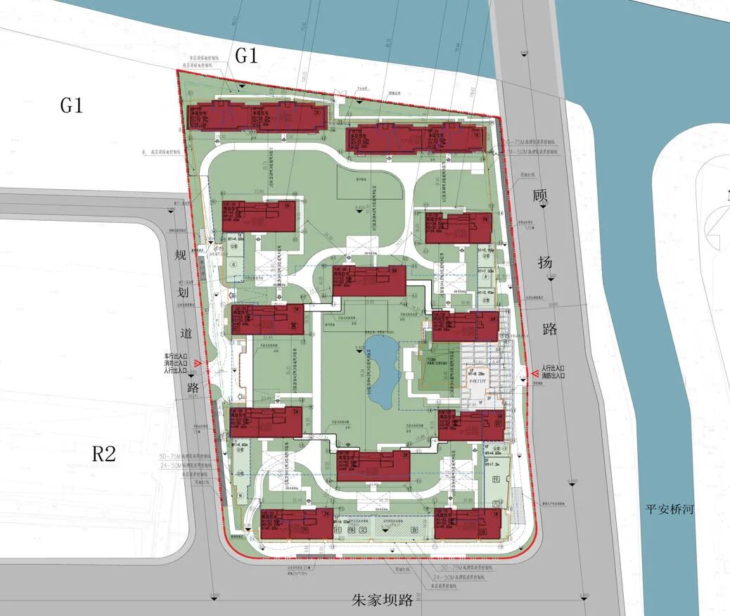 根据规划,这个项目占地34165㎡,容积率只有1.9,总建筑面积102153㎡,建筑密度22%,绿地率35%,建筑高度53.88米。