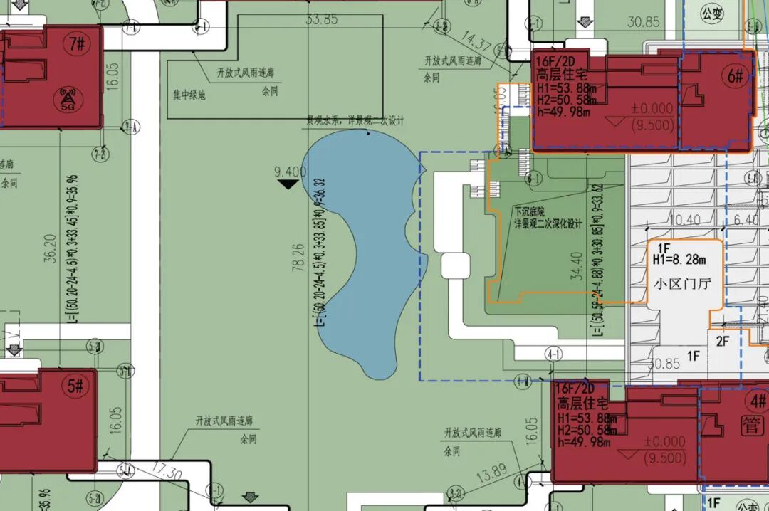 小区主入口位于东面的顾扬路上,设计了大面积的小区门厅,金色的镂空造型非常显眼。进来后就是自带水景的下沉庭院,并设计了风雨连廊。