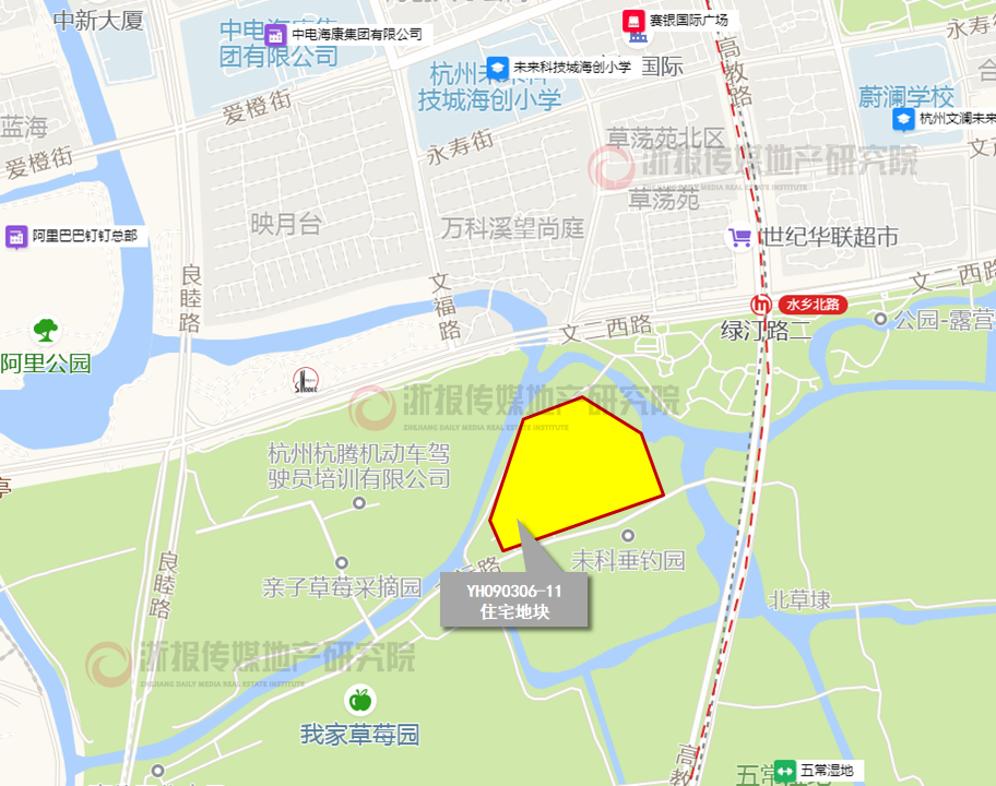 地块位于余杭区五常湿地北部,周边水系环伺,东侧即在建12号线水乡北路站,未来交通出行便捷。周边还有未来科技城海创小学、杭州文澜未来科技城学校、阿里巴巴钉钉总部和赛银国际广场等重要配套。