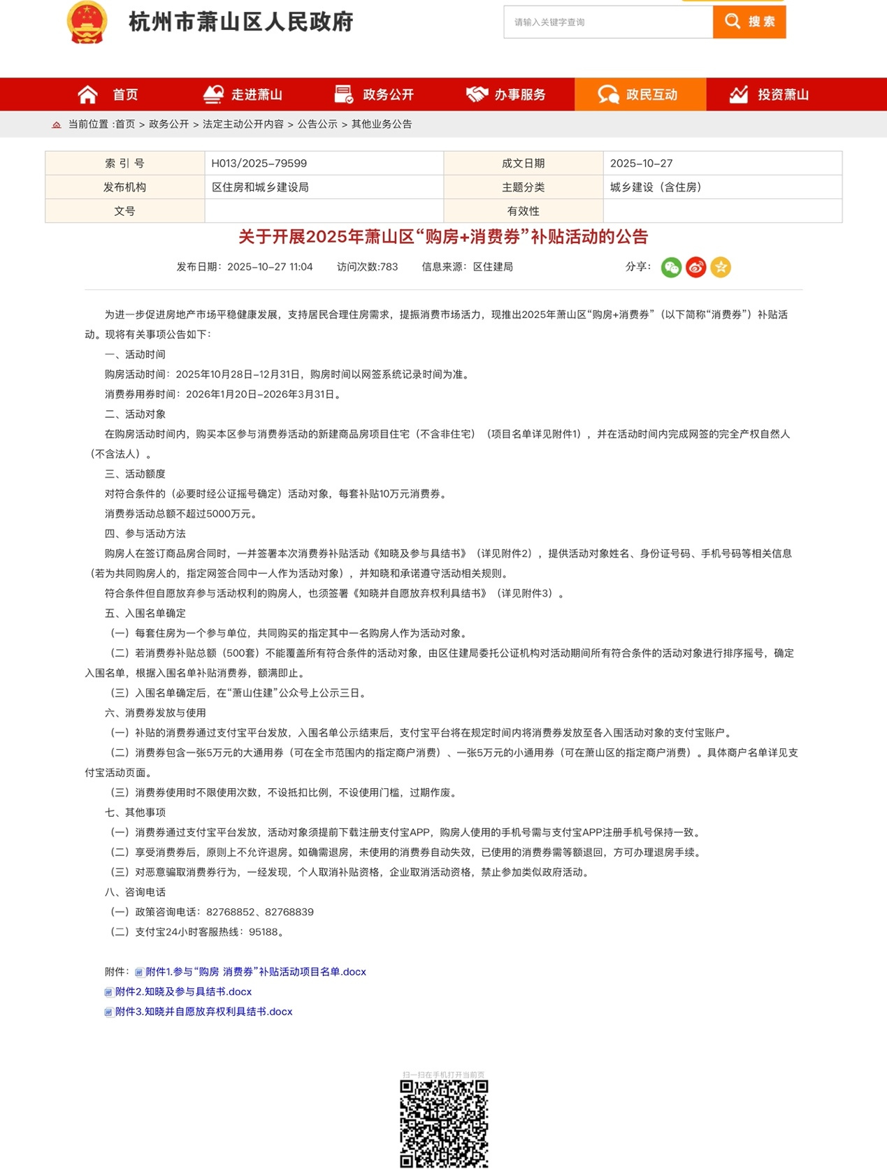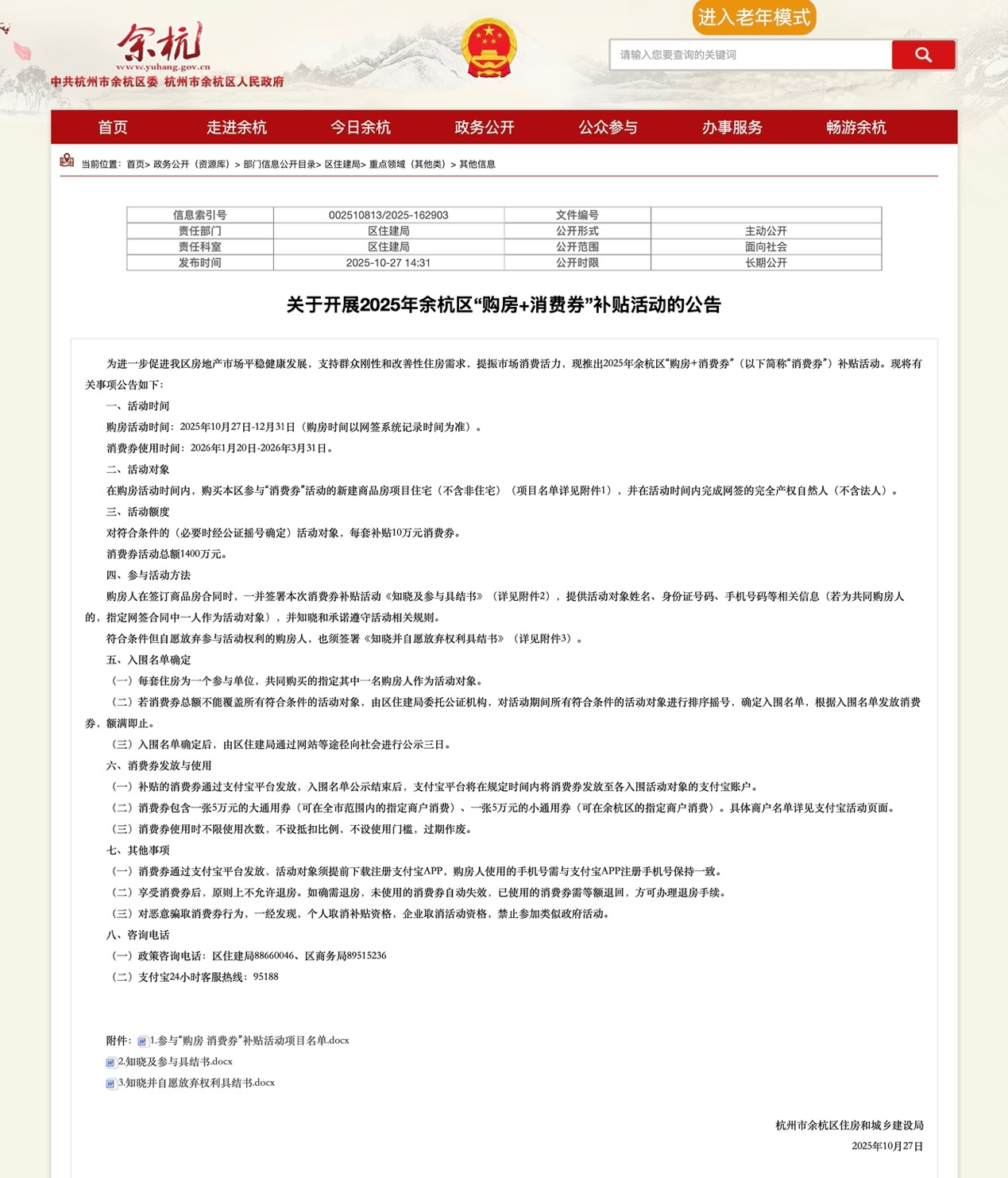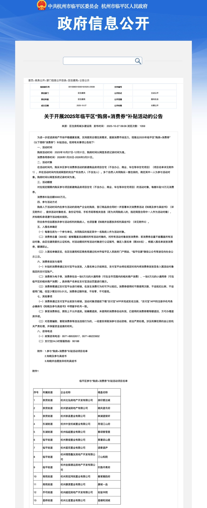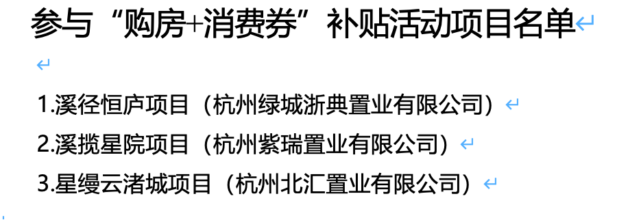 继10月24日富阳、临安、桐庐、淳安、建德5个区、县(市)发布“购房+消费券”限时补贴活动后,昨天,萧山、余杭、临平三区也发布了“购房+消费券”补贴活动的公告。规则与之前发布的公告一致,即在活动时间内,购买萧山、余杭、临平三区内参与活动的新建商品房项目住宅,每套将发放10万元消费券,消费券可在2026年1月20日-3月31日内使用。消费券包含一张5万元的大通用券(可在全市范围内的指定商户消费)、一张5万元的小通用券(可在购房所在区、县(市)的指定商户消费)。具体商户名单详见支付宝活动页面。
