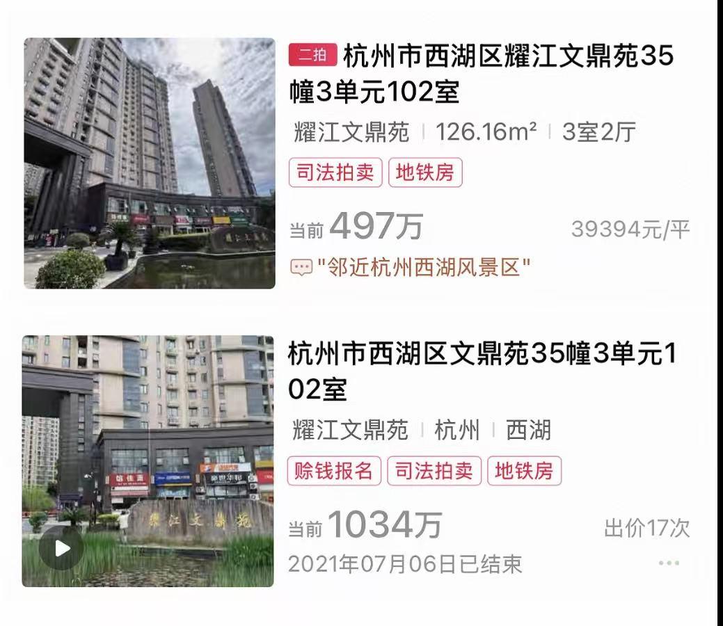 潮新闻讯 同一套法拍房,4年前曾经拍出1034万元,今年10月再次上架拍卖,成交价却低至497万元,跌幅高达52%。如此真实的法拍房价“腰斩”,就发生在杭州著名“孟母盘”文鼎苑身上