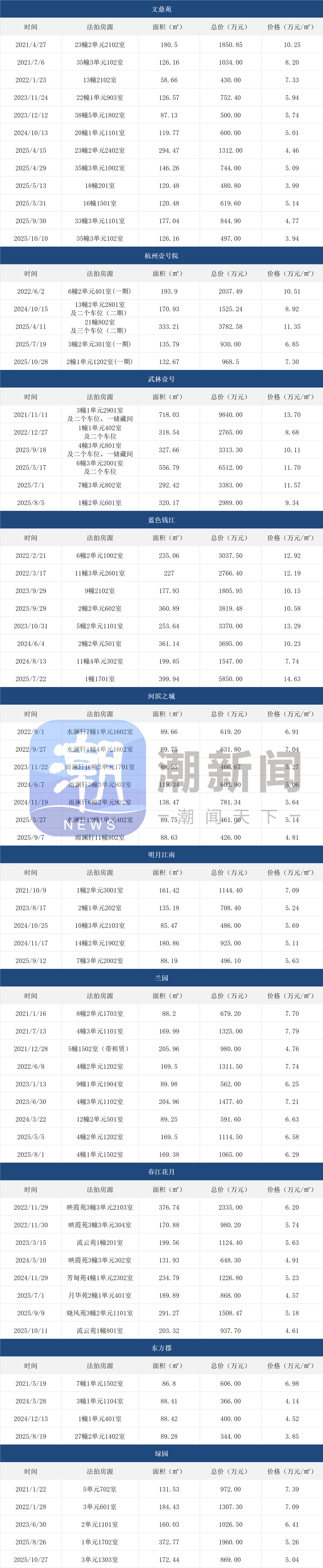滨江区的明月江南,2021年有一套房源以单价约7.09万元成交;今年9月明月江南一套法拍房以单价5.63万元成交,跌幅约20%。