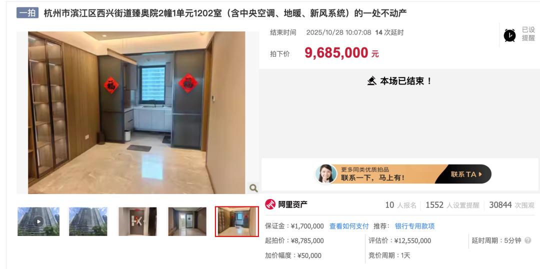 10月28日上午,一套位于杭州壹号院、建筑面积132.67平方米的法拍房,吸引了10人报名,30844次围观,经过18次出价,以总价968.5万元成交,折合单价7.3万元/平方米。