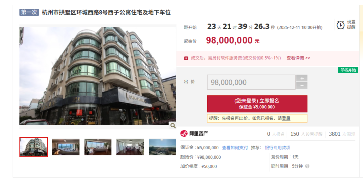 近日,阿里资产拍卖平台上架一套位于杭州市拱墅区环城西路8号西子公寓的住宅及地下车位,瞬间吸睛。