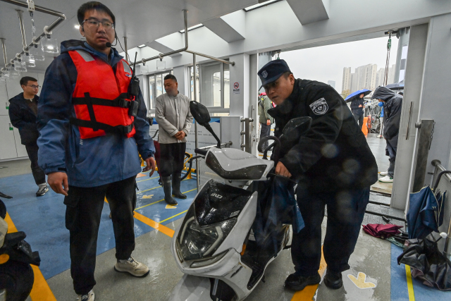 让记者比较意外的是,推电瓶车过门槛上下船,比想象中轻松。门口有两个管理人员协助,稍微借把力就过去了。上了船,把车子按车位停好,就可以站着等过江了,整个过程挺稳当,除了船靠岸时有一两下晃动,其余时间都没什么感觉,车子仅靠侧撑停着,也几乎纹丝不动。