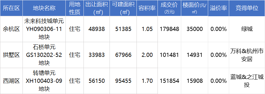 同日出让的转塘、石桥地块同样底价成交,拿地方分别为蓝城&之江城投联合体、万科&市安居联合体。