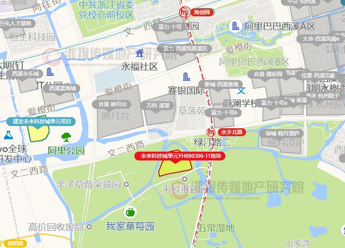 今天出让的未来科技城单元 YH090306-11 地块,容积率1.05,位于五常湿地北,东侧即在建的 12号线水乡北路站,1.3公里范围内有阿里巴巴西溪园区、海创园、钉钉总部(阿里中心)、字节跳动、在建VIVO全球研发中心等众多重量级产业,还不限房价。