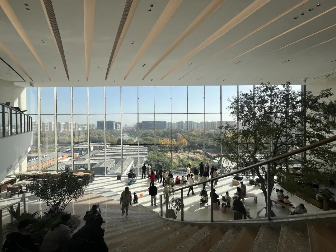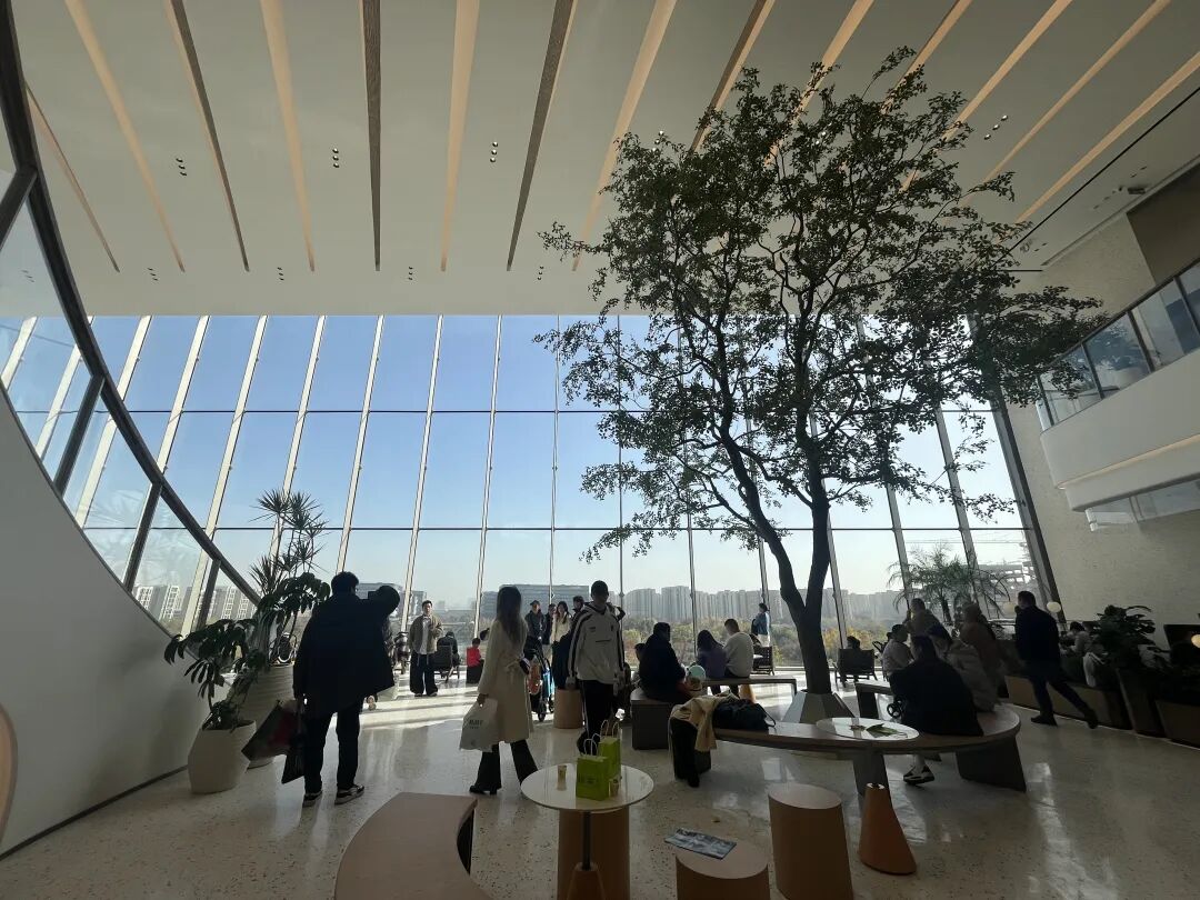 第二是位于商场5—6层的“丰收湖之眼”,10米挑高的跨层空间,配上宽幅落地景观幕墙,将丰收湖景观尽收眼底。同时,在这个观景空间,还做了很多可以休息的地方,搭配大型的绿植,颜值非常高,开业当天已经有不少消费者会选择在这里坐一坐、拍一拍。