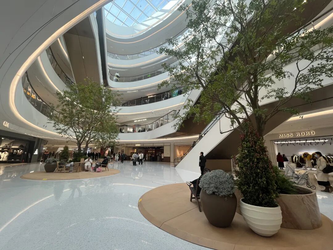 上城天街定位为“公园休闲生活综合体”,在项目内部也可以看到很多和自然互动互联的设计。尤其像今天这样的天气,走进这座天街,会觉得采光非常好。室内主要以浅色系为主色调,采用了很多弧形线条、木质材料,搭配上大量的绿植,让空间有了呼吸感。