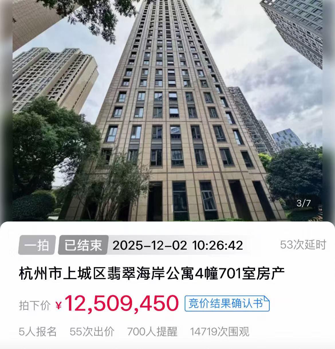 其中,望江新城板块的次新豪宅翡翠海岸一套建筑面积161.05㎡的法拍房源以1079万元起拍,吸引了5人报名,经过55轮竞价,最终以1250.945万元成交,折合成交单价约7.76万元;