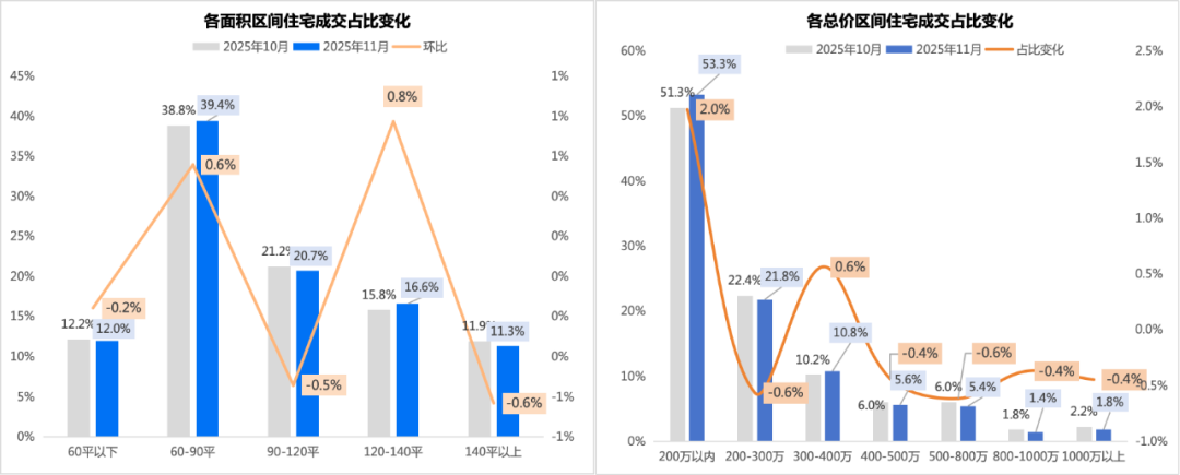 面积方面,60-90平方米房源占比提高0.6%,120-140平方米房源占比提高0.8%,其余价格区间房源占比都下滑。
