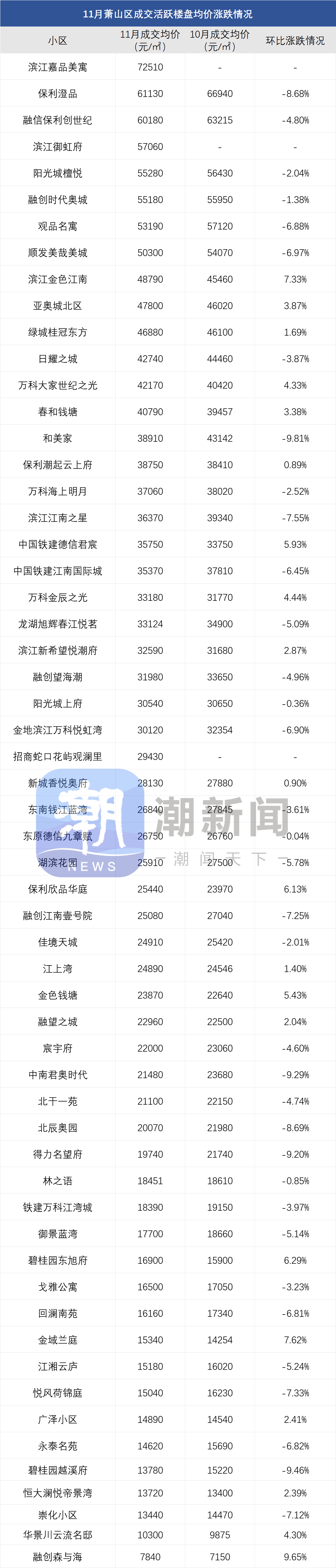 11月,杭州二手房终于在“七连跌”后迎来转折,市区(含富阳、临安)共成交二手房6561套,环比提升10.6%。不过,从潮新闻美好生活研究院统计的涨跌榜数据来看,二手房的价格仍在下跌,尤其是萧山区,降价小区数量已经达到涨价小区的两倍。
