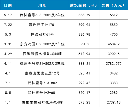 去年杭州十区成交总价最高的10套房源中,武林壹号占据3席,其中最贵的一套就出自武林壹号6幢(带2车位),建筑面积556.79㎡,成交价6512万元。总价第二高的房源是蓝色钱江楼王的一套房子,建筑面积399.94㎡,成交价5850万元。