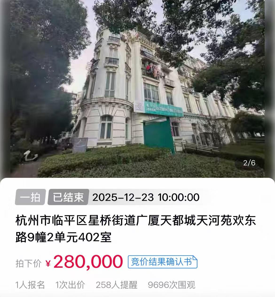 据潮新闻美好生活研究院的统计,2025年,阿里资产平台上杭州十区有4000多次住宅房源被法拍,最后实际成交了2286套。