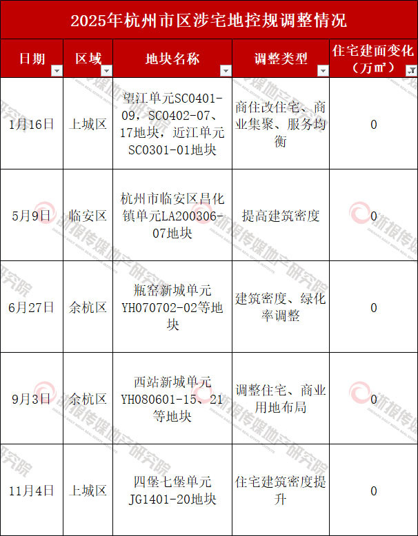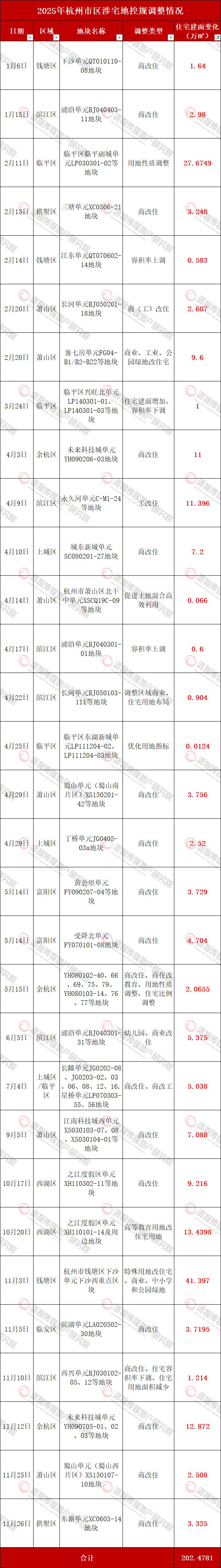 2025年,杭州市区共发布65则关于涉宅地控规调整的公示,这些控规调整增加了杭州市区住宅建面共计90.5万㎡。其中,商改住涉及的建面超过100万㎡。