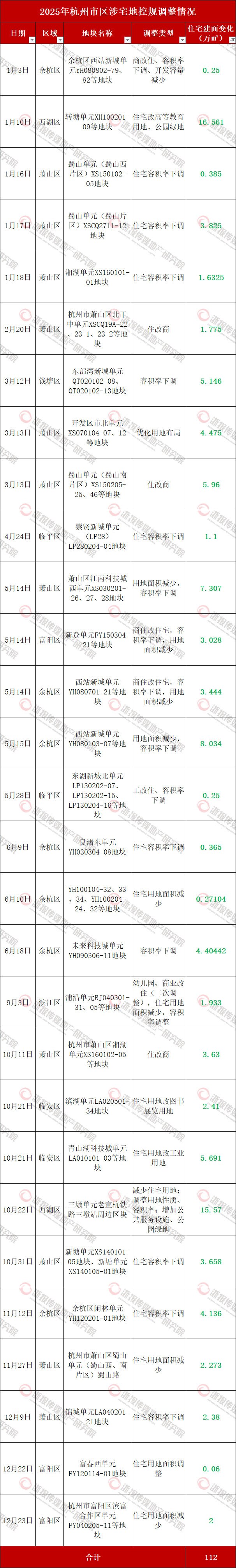 29则公示涉及优化用地布局、住宅容积率下调、住宅用地面积减少、住宅用地改其他性质用地等,共减少住宅建面112万㎡。其中,住宅容积率下调占大部分。