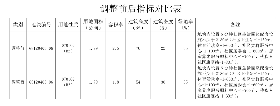 调整内容:调整本地块控制指标,容积率由2.5调整为1.8、建筑高度由70米调整为54米、建筑密度由22%调整为30%。