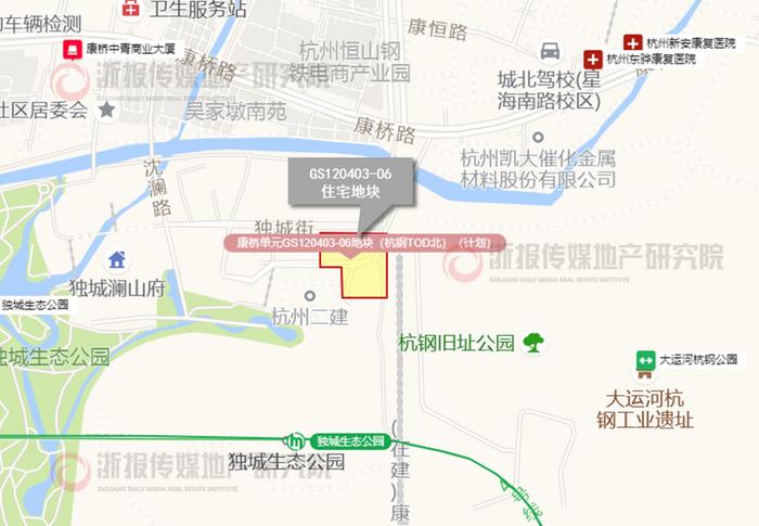 地块位于拱墅区杭钢板块内,南侧不远处即为大运河杭钢公园。周边城市配套设施较少,整体界面有待持续开发建设。目前,板块内无在售待售项目,最近在售项目为西面1.8公里处的绿城·熙岸晓月轩,近期高层在售均价为37913元/㎡。