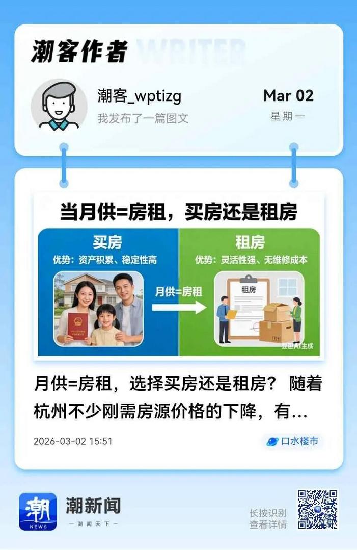 随着杭州房价回调,市中心及临平、闲林等刚需板块越来越多房源出现“月供≈房租”的现象。那么,到底是买房还是租房更划算?潮新闻潮圈“口水楼市”吵翻了天。