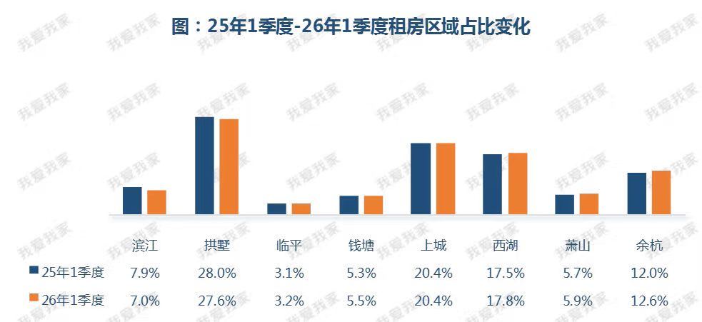 杭州我爱我家数据也印证了这一趋势。一季度杭州整体租房量同比上涨7.8%,其中3月在节后返工和求职旺季的推动下,租房量环比飙升201.5%,同比增幅达38.8%。从区域分布看,拱墅、上城、西湖三大核心区合计占比65.8%,市场主导地位稳固,而余杭区占比同比上升0.6个百分点至12.6%,成为外围区域中需求外溢增长最快的板块。