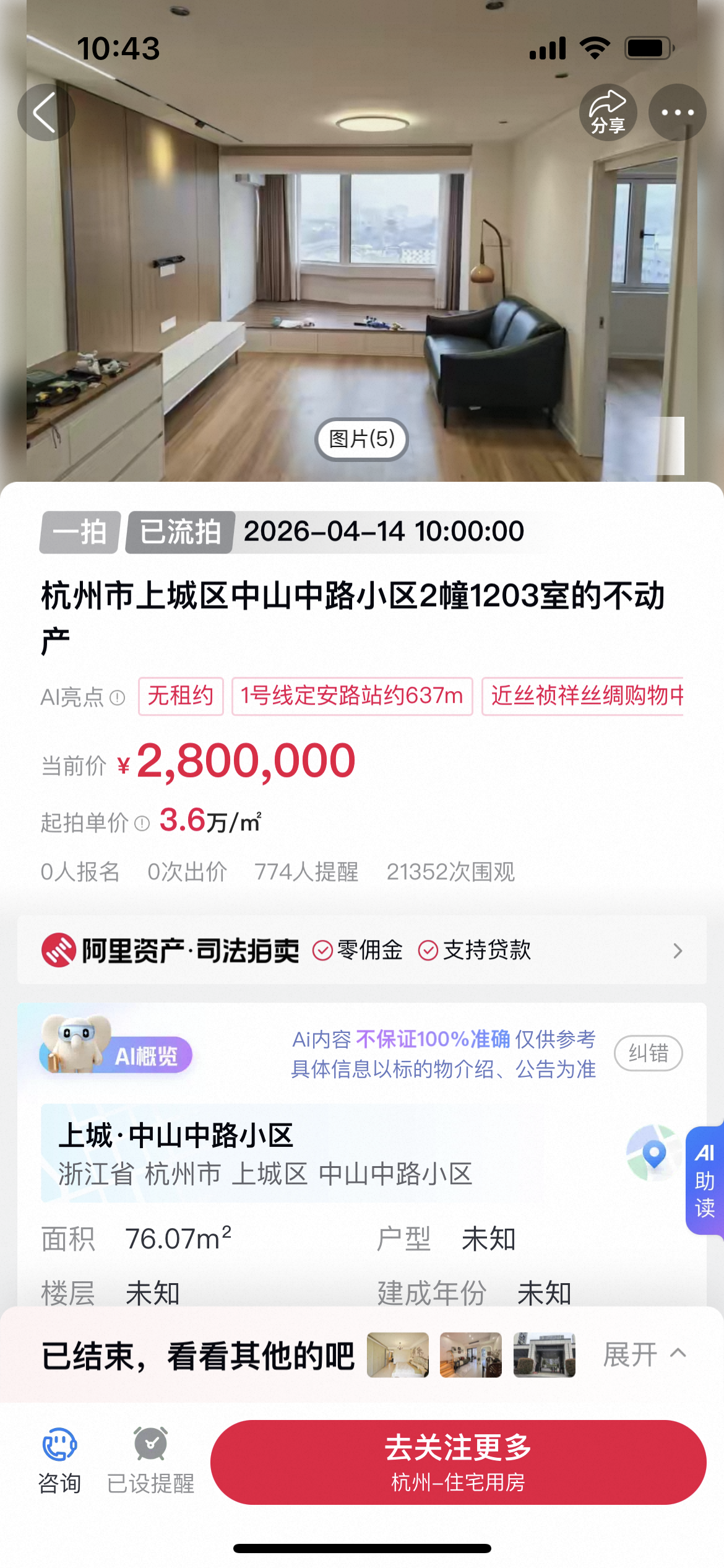 该房源单元格局为两梯多户,室内户型布局为2室1厅1厨1卫,室内带精装修。房子起拍价280万元,折合单价约3.68万元。虽然有2万多人次围观,但最终因为无人报名而流拍。
